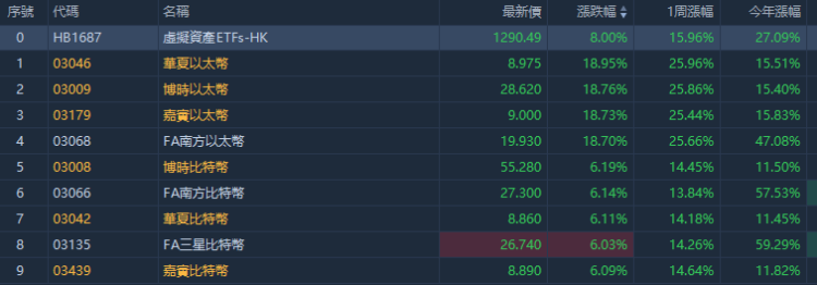 华盛资讯5月21日讯,区块链概念股早盘大涨,FA南方以太币ETF、博时以太币ETF、华夏以太币ETF、嘉实以太币ETF均涨超18%;FA南方比特币ETF、FA三星比特币ETF、博时比特币ETF、华夏比特币ETF、嘉实比特币ETF均涨超6%。消息面上,比特币价格一个多月来首次突破7万美元大关。