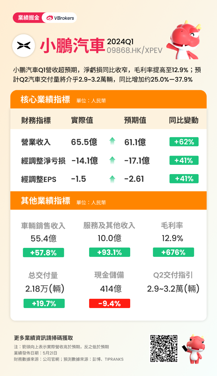 小鹏汽车 $XPEV / $09868.HK 今日发布了2024年第一季度财报:第一季度营收65.5亿元,同比增长62.3% ,高于预期的61.1亿元;净亏损13.7亿元,而上年同期净亏损23.4亿元,上一季度净亏损13.5亿元;不按美国通用会计准则,调整后的净亏损为14.1亿元,而上年同期净亏损22.1亿元,上一季度净亏损17.7亿元。