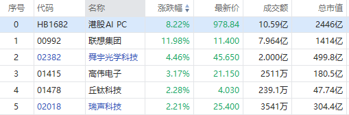 5月22日讯,港股电脑股走势活跃,联想集团涨近10%,舜宇光学涨超4%,高伟电子涨超3%。