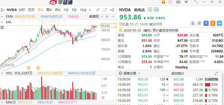 身为人工智能芯片第一股,英伟达的业绩无疑对市场来说是个重磅信号。周二,英伟达股价收盘涨至954美元,再次创造历史新高,投资者们似乎仍然相信英伟达会在即将到来的财报会议上续写新的辉煌。
