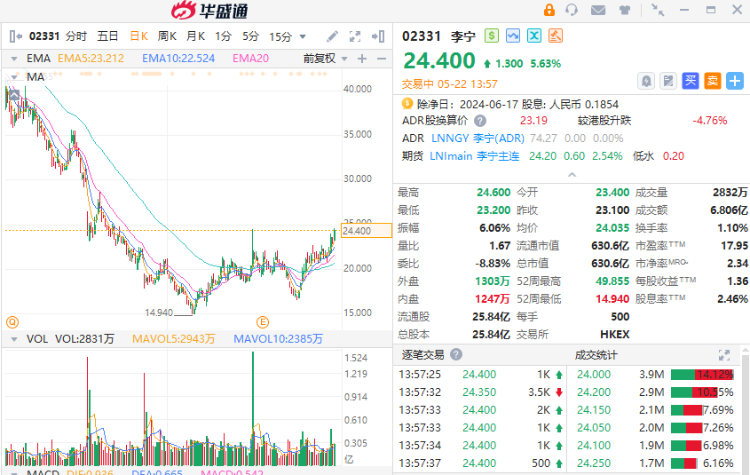 李宁(2331.HK)盘中一度涨5.41%至24.35港元,股价创3月12日以来新高;李宁年内累涨超15%。
