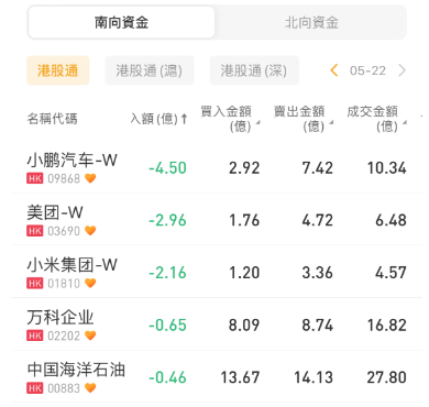 其中,南向资金净买入中国银行7.2亿港元、建设银行3.2亿港元、腾讯控股1.14亿港元;净卖出小鹏汽车4.5亿港元。