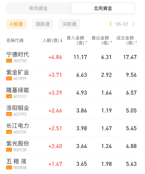 北向资金今日净买入47.76亿元。宁德时代、紫金矿业分别获净买入4.86亿元、3.71亿元。比亚迪净卖出额居首,金额为2.39亿元。