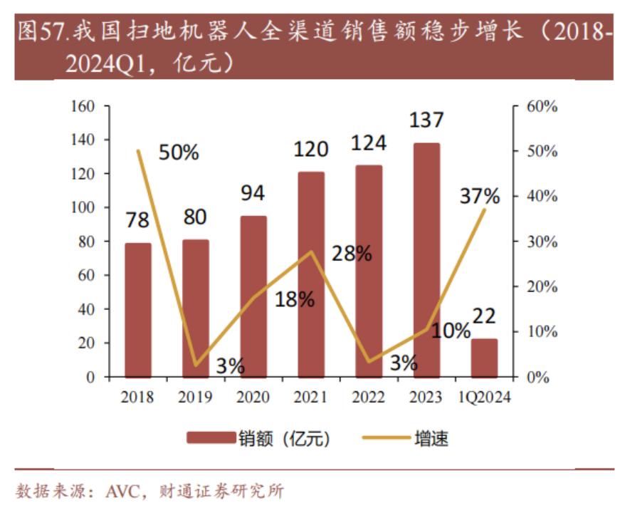 奥维云网的数据显示,2024 年一季度,扫地机器人的市场销售额呈现加速增长态势,同比增长 37%,而这主要由销量(同比增长 33%)拉动。过去两年这一数字则分别只有3%和10%。