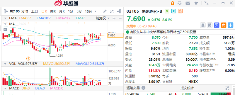 来凯医药-B(02105)股价盘前走高,截至发稿,高开8.15%,报7.7港元,盘前成交额144万港元。