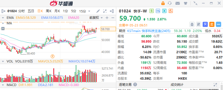5月23日讯,快手-W(01024)绩后高开逾4%,截至发稿,涨2.67%,报59.7港元,成交额19.62亿港元。