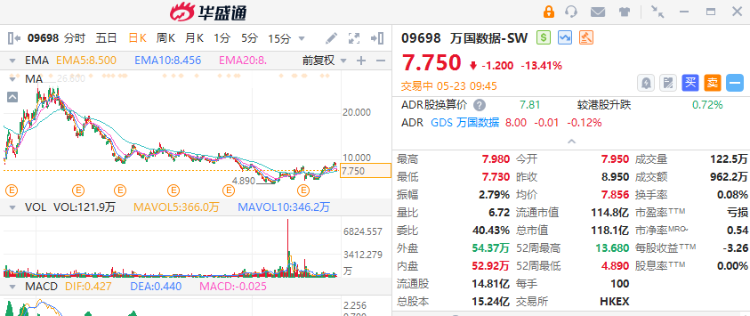 万国数据大跌超12%至7.83港元;隔夜美股万国数据(GDS.US)收跌13.87%报8.01美元,折算成港股市场价格为7.89港元/股。