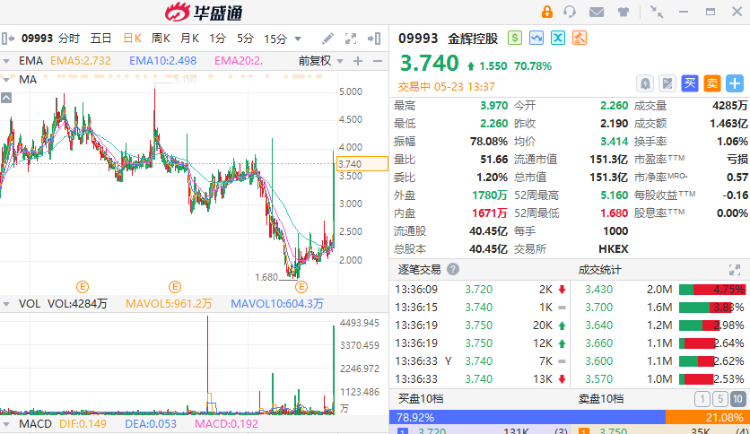 5月23日讯,港股地产商金辉控股(09993)盘中飙升逾70%,截至发稿,报3.74港元,成交额1.46亿港元。
