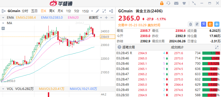 现货黄金一度失守2360美元/盎司,创逾一周新低,为5月15日来首次。现跌0.65%报2362.75美元/盎司, COMEX黄金期货跌1.29%报2362美元/盎司。