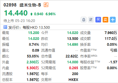 华盛资讯05月23日讯,港股盛禾生物-B正在暗盘交易中,截至发稿涨6.96%,报14.44港元/股,中签一手账面浮盈188港元,最新总市值超22.62亿港元。该股预计将于5月24日正式挂牌上市,配售结果将于今日晚间披露。