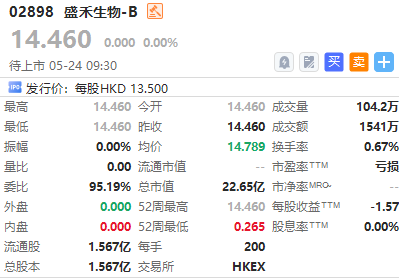 华盛资讯05月24日讯,港股盛禾生物-B今日挂牌,截至发稿涨0.00%,报14.46港元/股,中签一手账面浮盈0.0港元,最新总市值超22.65亿港元。该股此前公开发售获10.08倍认购,一手中签率7.82%。