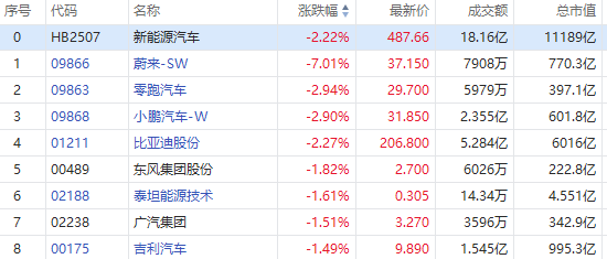 港股新能源车板块早盘集体下挫,蔚来跌近7%。消息方面,中国乘用车市场信息联席会公布最新调研结果显示,零售量占总市场八成以上的龙头厂商5月零售目标与去年同期相比微降5%左右。初步推算,5月狭义乘用车零售总市场规模约165万辆左右,按年同比减少5.3%。他们还指出,上半月市场热度明显低于往年同期,五一之后终端人气回落,各厂商纷纷出台加码促销,