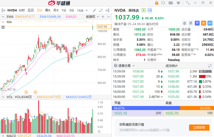 当地时间5月23日,发财报后的第二天,英伟达(Nasdaq:NVDA)股价高开后突破每股1000美元,收于每股1037.99美元,涨9.32%,总市值达到2.55万亿美元。目前,英伟达依然是市值仅次于微软(3.17万亿美元)和苹果(2.87万亿美元)的全球第三大科技巨头。Wind数据显示,在过去的2023年中,英伟达股价涨幅超230%,今年以来涨幅已达到109.61%。