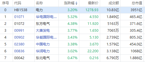 截至发稿,港股电力股集体上涨,其中华电国际电力股份 (01071.HK)涨超5%,大唐发电 (00991.HK)、华能国际电力股份 (00902.HK)、中国电力 (02380.HK)、华润电力 (00836.HK)跟涨。