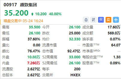 华盛资讯05月24日讯,港股趣致集团正在暗盘交易中,截至发稿涨40%,报35.2港元/股,中签一手账面浮盈2040港元,最新总市值超85亿港元。该股预计将于5月27日正式挂牌上市,配售结果将于今日晚间披露。
