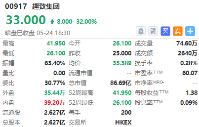 华盛资讯05月24日讯,港股趣致集团暗盘收涨32.00%,报33.00港元/股,中签一手账面浮盈1600.0港元,最新总市值超86.69亿港元。