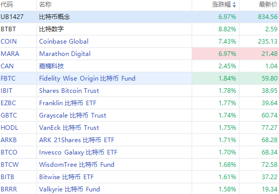 华盛资讯5月24日消息,加密货币概念股走强,截至发稿,比特数字涨超8%,Coinbase Global涨超7%,Marathon Digital涨超6%,微策略涨超4%,嘉楠科技涨超2%。