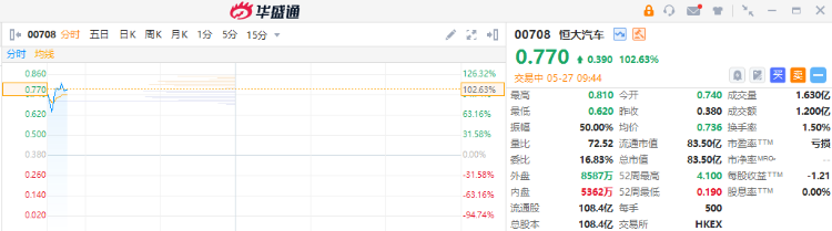 华盛资讯5月27日消息,恒大汽车 $00708.HK 复牌持续拉升,一度涨超110%,此前公告,31.45亿股潜在待售股份(占全部已发行股份的约29.0%)将即时被收购。