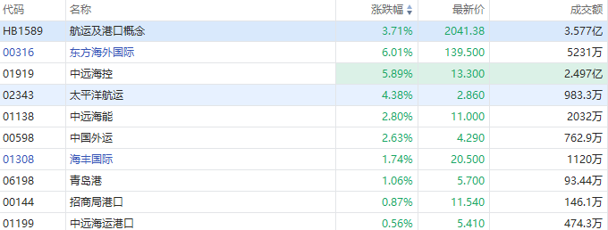 海运股早盘集体拉升,截至发稿,东方海外国际(00316)涨6.01%,报139.5港元;中远海控(01919)涨5.89%,报13.3港元;太平洋航运(02343)涨4.38%,报2.86港元;中远海能(01138)涨2.8%,报11港元。