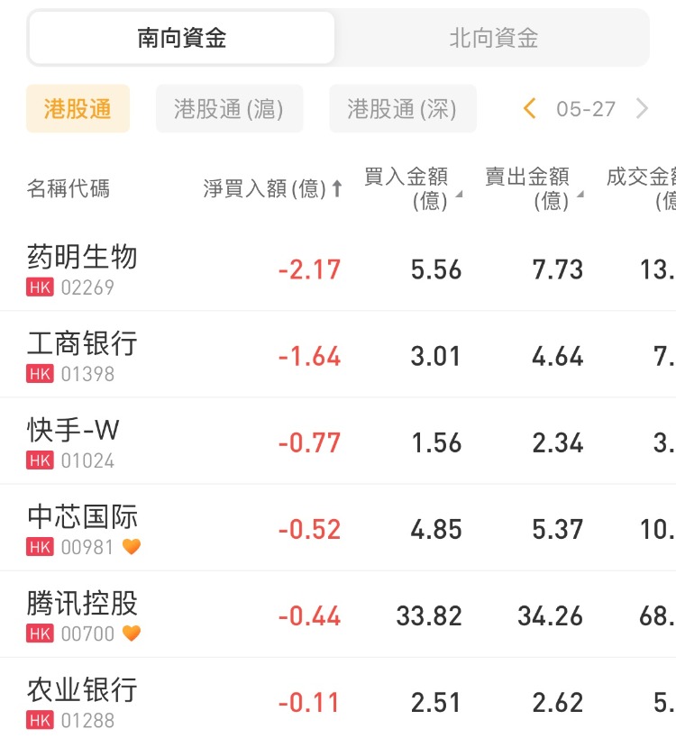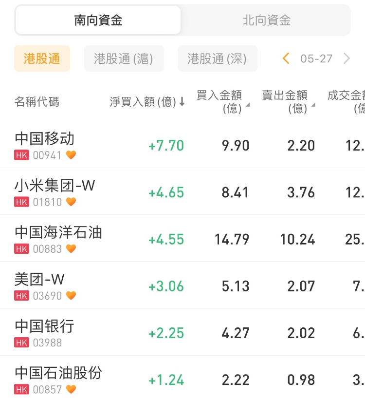 其中,南向资金净买入中国移动7.7亿港元、小米集团4.65亿港元、中国海洋石油4.55亿港元;净卖出药明生物2.17亿港元、抛售工商银行1.64亿港元。