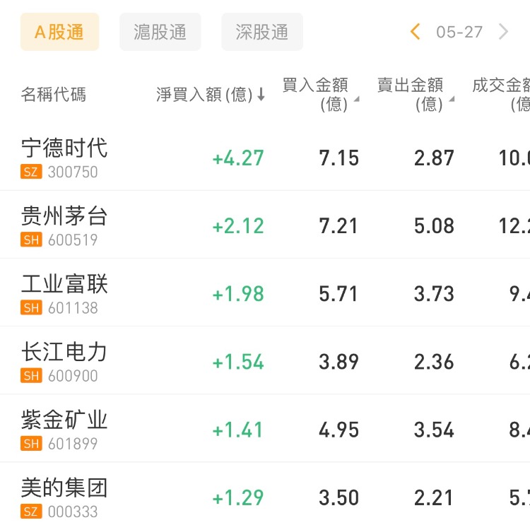 北向资金今日净买入27.48亿元。宁德时代、贵州茅台、工业富联分别获净买入4.27亿元、2.12亿元、1.98亿元。潍柴动力净卖出额居首,金额为3.71亿元。