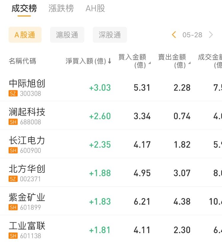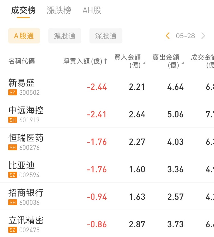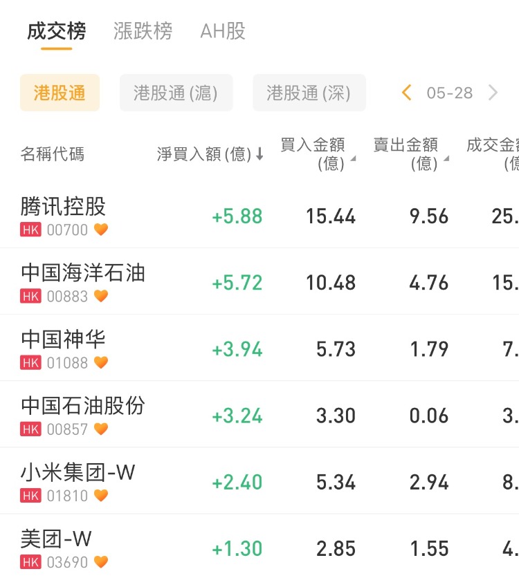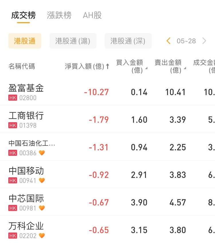 其中,南向资金净买入腾讯控股5.88亿港元、中国海洋石油5.72亿港元、中国神华3.94亿港元;净卖出盈富基金10.27亿港元、抛售工商银行1.79亿港元。