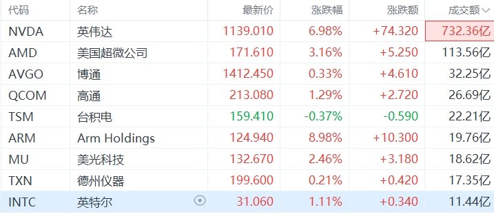 格隆汇5月29日|英伟达收涨6.98%报1139.01美元,创历史新高,总市值2.8万亿美元。Arm控股涨8.98%,阿斯麦ADR涨超3.7%,AMD涨超3.1%,希捷科技、Nova、Wolfspeed至少涨超2.8%;美光科技收涨2.46%,报132.67美元,连续第二个交易日创收盘历史新高,市值将近1500亿美元;安森美、高通、莱迪斯半导体、英特尔、艾克尔科技至少涨约1.1%,其中高通继续创收盘历史新高,市值将近2400亿美元;恩智浦涨约0.9%,创收盘历史新高;Tower半导体ADR和ASM国际ADR涨约0.5%,博通涨超0.3%,获得“野蛮人”艾略特(即维权投资者Elliot)数十亿美元投资的德州仪器涨超0.2%。