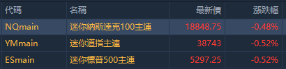 美股盘前,三大股指期货走低,截至发稿,纳指期货 $NQmain 跌0.48%,标普500指数期货 $ESmain 跌幅0.52%,道指期货 $YMmain 跌幅0.52%。