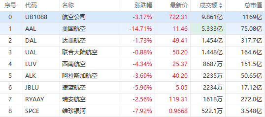 美国航空下调二季度利润预期后大跌超14%,拖累其他航空股走低,捷蓝航空跌约6.9%,西南航空跌约6.4%,阿拉斯加航空跌近5%,联合大陆航空跌近4%,达美航空跌约3.3%。
