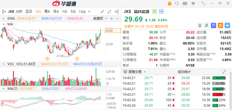 晶科能源(JKS.US)涨5.3%,报29.94美元。消息面上,晶科能源宣布与澳大利亚ACLE Services在D-BESS项目的合作上取得进展。晶科能源正式与ACLE签订合同,为其提供84兆瓦时的地面电站储能系统,该系统是ACLE为可持续能源基础设施建设的7个项目的核心。此外,国务院印发《2024—2025年节能降碳行动方案》,加大非化石能源开发力度;加快建设以沙漠、戈壁、荒漠为重点的大型风电光伏基地。