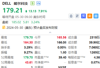 隔夜,美股戴尔科技股价又创新高,大涨近8%,报179.21美元/股,总市值1273.21亿美元。今日盘前戴尔继续走高,现涨超3%。