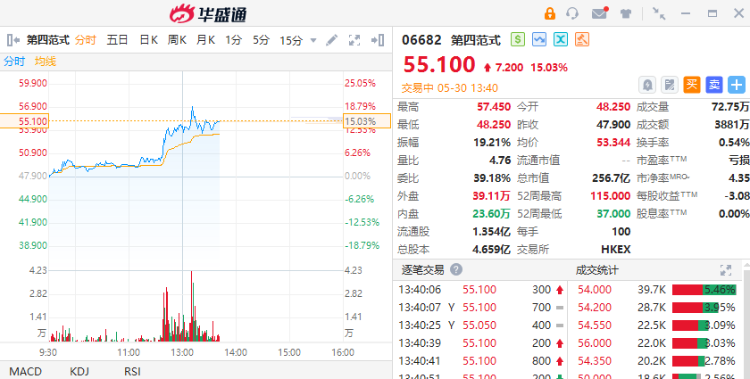 5月30日,第四范式(06682)午后最高升19%,截至发稿,涨15.03%,报55.1港元,成交额3881万港元。