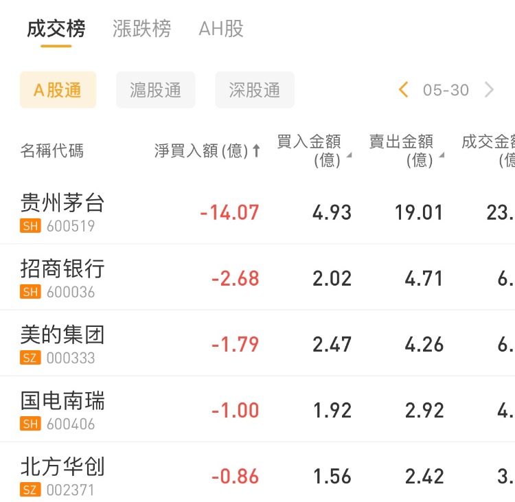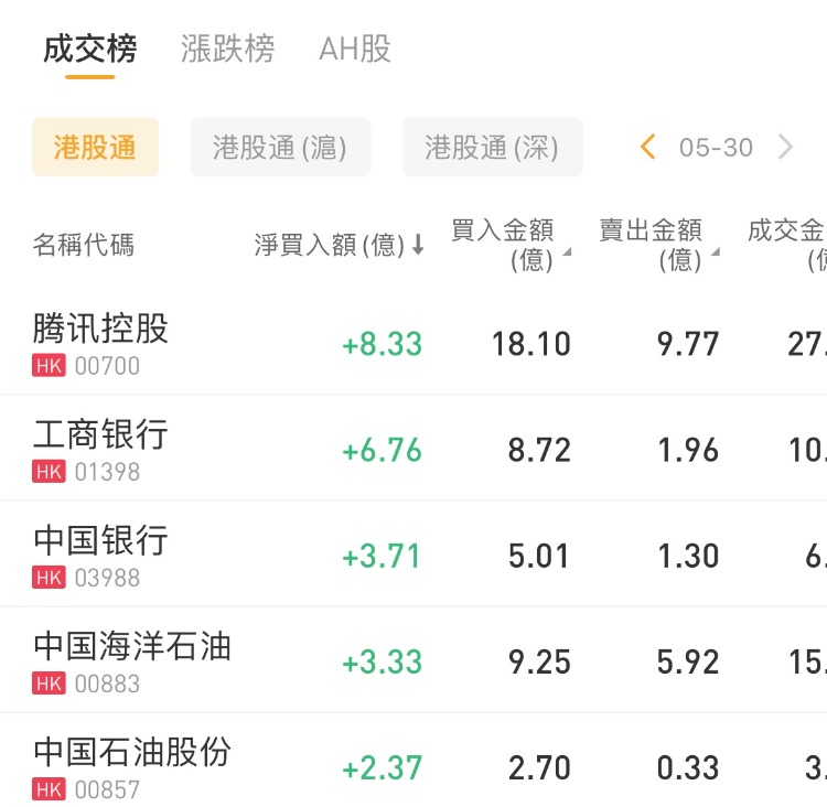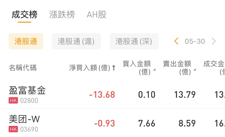 其中,南向资金净买入腾讯控股8.33亿港元、工商银行6.76亿港元、中国银行3.71亿港元;净卖出盈富基金13.68亿港元、抛售美团-W0.93亿港元。