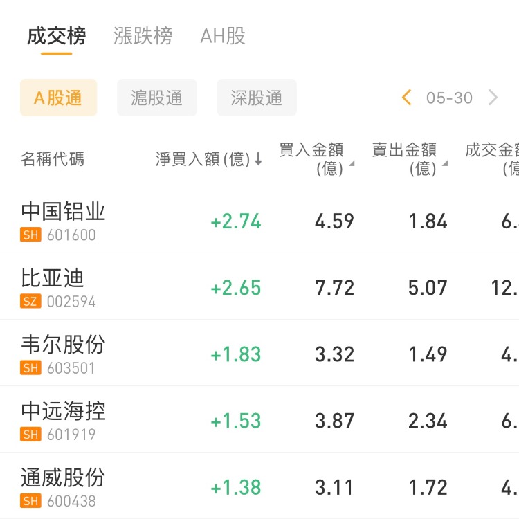 北向资金今日净买入10.45亿元。中国铝业、比亚迪、韦尔股份分别获净买入2.74亿元、2.65亿元、1.83亿元。贵州茅台净卖出额居首,金额为14.07亿元。