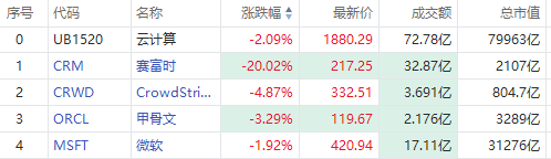云计算巨头赛富时绩后暴跌20%带崩板块,截至发稿,现在服务跌超8%,CrowStrike跌超4%,甲骨文跌超3%。