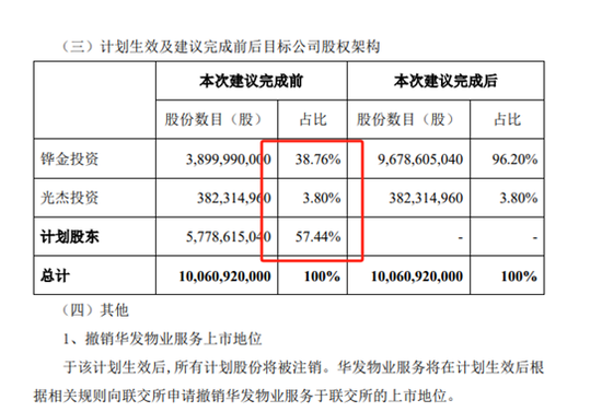 华发股份同期发布的公告披露称,协议安排在取得先决条件后,除铧金投资及光杰投资所持有外的所有股东57.44%的股份将被注销。光杰投资为华发股份全资子公司,光杰投资持有铧金投资100%股权。