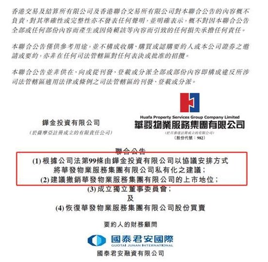 对于私有化的原因,华发物业服务在公告中披露:上市平台的使用度有限、减低维持公司上市地位的成本及开支等。