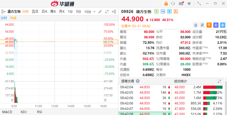 5月31日,康方生物(09926)早盘高开,盘中股价一度涨近50%,截至发稿,涨40.31%,报44.9港元,成交额10.23亿港元。