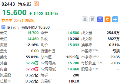 华盛资讯05月31日讯,港股汽车街今日挂牌,截至发稿涨52%,报15.6港元/股,中签一手账面浮盈1080港元,最新总市值超129.9亿港元。该股此前公开发售获433.34倍认购,一手中签率5.01%。