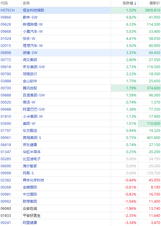 其他科网股方面,哔哩哔哩-W涨超6%,富瑞预计,哔哩哔哩第三季实现经调整运营亏损平衡,维持“买入”评级;快手-W涨超4%,大摩发研指,对快手未来1至2年的股价前景更加乐观,看好基本面发展带来盈利,全年广告收入将同比增长25%;微博涨超3%,中信建投指其垂类内容规模持续增长并占比40%,有望进入新一轮广告上行周期。
