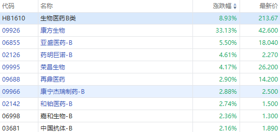 今日,港股全线反弹,截止发稿,恒指、国指和恒生科技指数均涨超1%,其中创新药板块表现亮眼,康方生物涨超33%,亚盛医药-B涨超5%,药明巨诺-B、荣昌生物涨超4%。