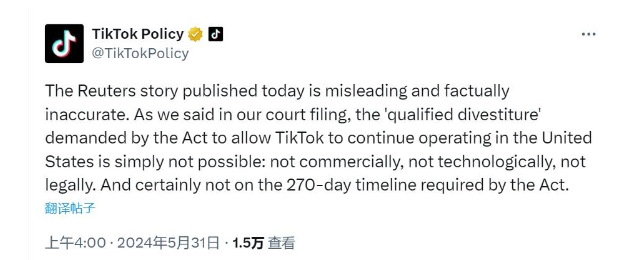 随后TikTok的社交媒体账号发文回应相关消息称,“相关报道具有误导性,且与事实不符”,TikTok也如此前向美国联邦法院提起诉讼寻求推翻禁令时表示,“该法案要求的‘有条件的剥离’以允许TikTok继续在美国运营是根本不可能的:商业上不可能,技术上不可能,法律上也不可能。当然也不可能在该法案要求的270天时限内完成。”
