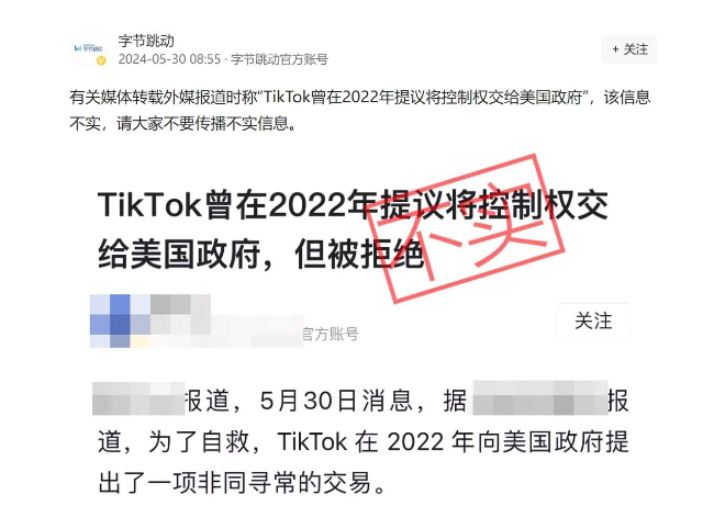 此外,字节跳动官方账号昨日发布公告,有关媒体转载外媒报道时称“TikTok 曾在 2022 年提议将控制权交给美国政府”,该信息不实,请大家不要传播不实信息。