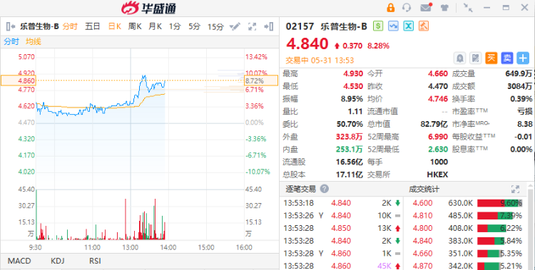 5月31日,乐普生物-B(02157)股价走强,截至发稿,涨8.28%,报4.84港元,成交额3084万港元。
