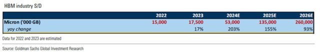 高盛预测,2024年,美光的HBM产能将同比增长203%,产能增长将延续至2026年。