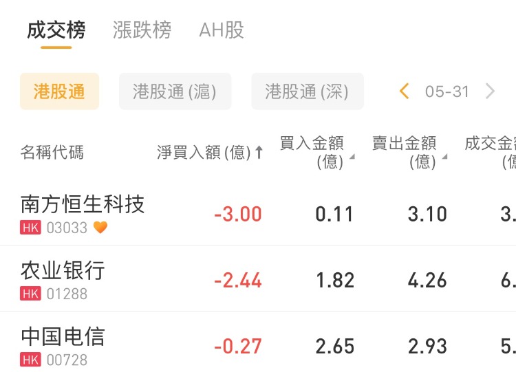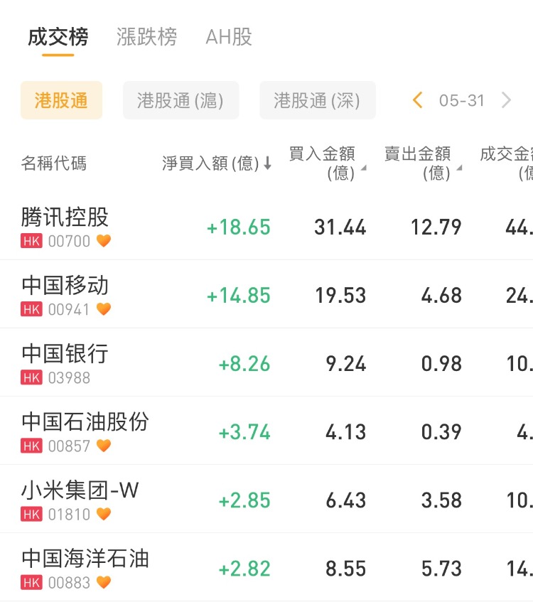 其中,南向资金净买入腾讯控股18.65亿港元、中国移动14.85亿港元、中国银行8.26亿港元;净卖出南方恒生科技3亿港元、抛售农业银行2.44亿港元。