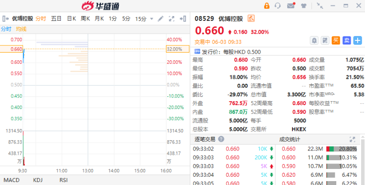 华盛资讯6月03日讯,港股优博控股今日挂牌,截至发稿涨32.00%,报0.66港元/股,中签一手赚800.0港元,最新总市值3.30亿港元。该股此前公开发售获2503.03倍认购,一手中签率0.2%。