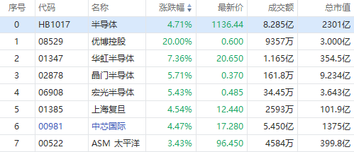 华盛资讯6月3日讯,港股半导体板块集体走强,截至发稿,华虹半导体大涨逾7%,上海复旦、中芯国际涨超4%,ASM太平洋涨超3%。