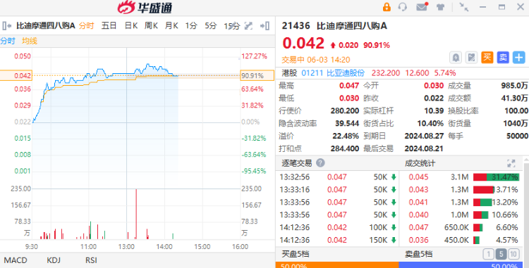 如投资者部署短线追入可参考比迪购(21436) $21436.HK ,行使价280.2港元,实际杠杆近10倍,2024年8月27日到期。如看淡正股后市可注意比迪沽(22389) $22389.HK ,行使价192.3港元,实际杠杆9.3倍,2024年9月23日到期。