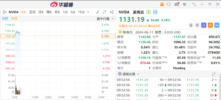 华盛资讯6月3日消息,美股早盘,三大股指走势分化,纳指涨幅扩大至1%,标普500指数涨0.38%,道指跌0.05%。